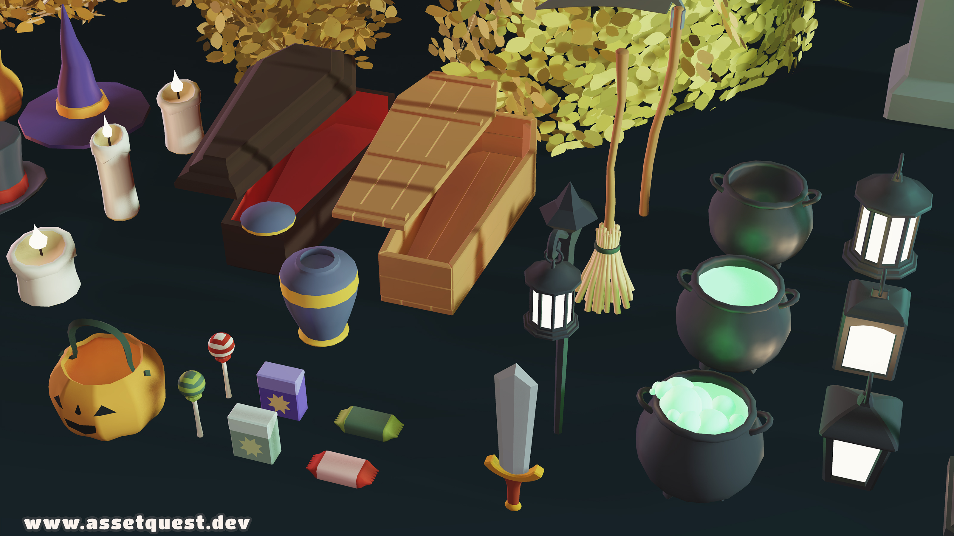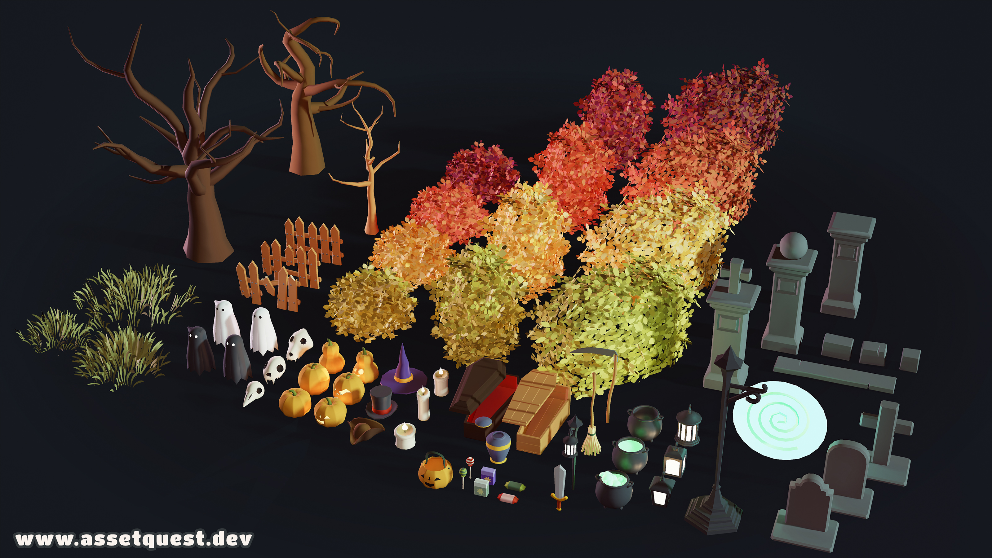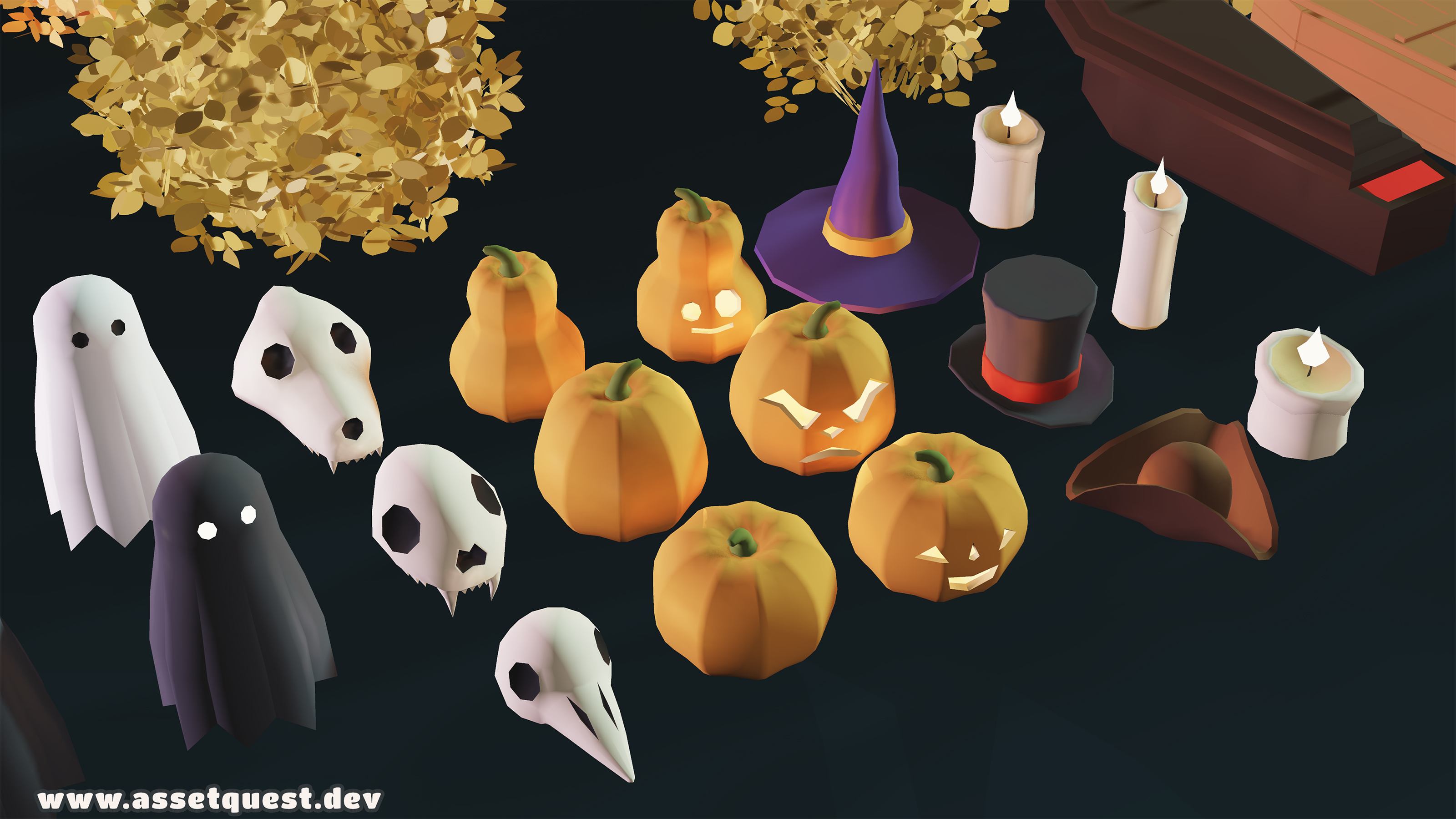 Free low-poly Halloween asset kit with 72 props + 5 pre-assembled bonus meshes!